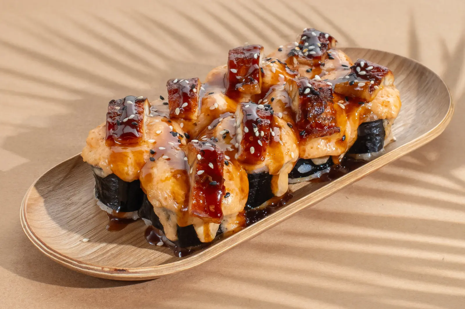 320 g, Unagi ∙ Gouda ∙ Cucumber ∙ Cream cheese ∙ Mayonnaise ∙ Tobiko ∙ Sriracha ∙ Sweet chili ∙ Unagi sauce ∙ Sesame
