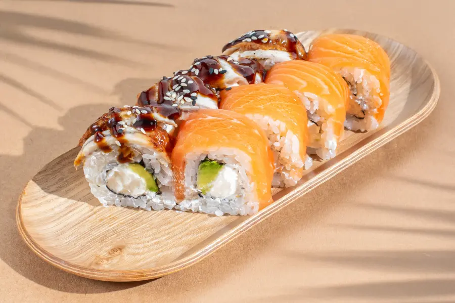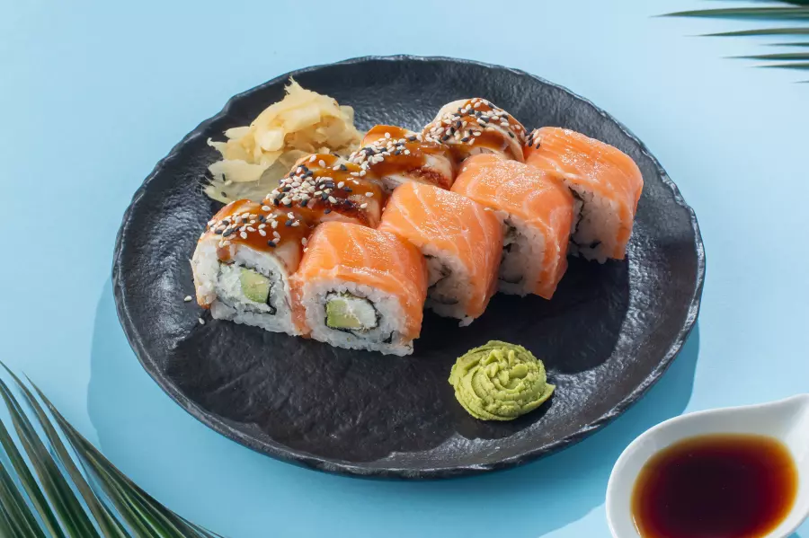 Ingredients: unagi, salmon, teriyaki, sesame, cream cheese, avocado.