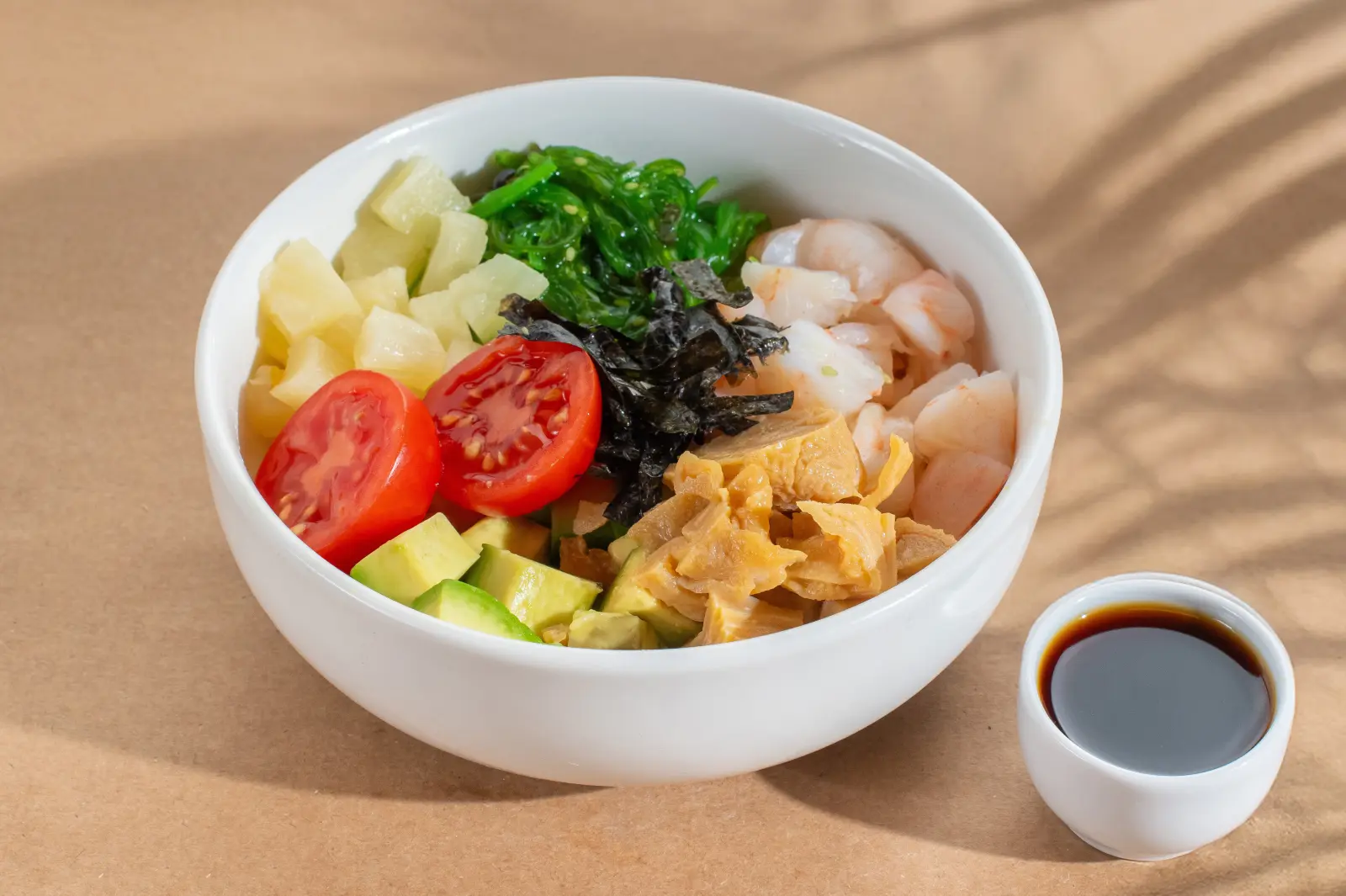 Ingredients: rice, shrimps, japanese omelette, avocado, cherry tomato, pineapple, goma wakame, nori, ponzu sauce.