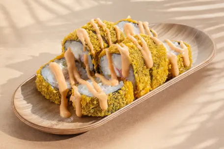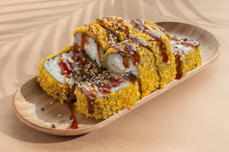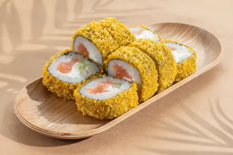 Orlando Weight: 300 grams.Ingredients: salmon, cream cheese, cucumber, tempura flour, panko breadcrumbs.Dish comes with a free serving of soy sauce, wasabi and ginger. Nutritional valueper 100 g 202kcal 6,8 gproteins 8,5 gfats 24,6 gcarbs per portion 634kcal 21,3 gproteins 26,5 gfats 77,2 gcarbs per piece 79kcal 2,7 gproteins 3,3 gfats 9,6 gcarbs Price 1090 RSD Add to cart