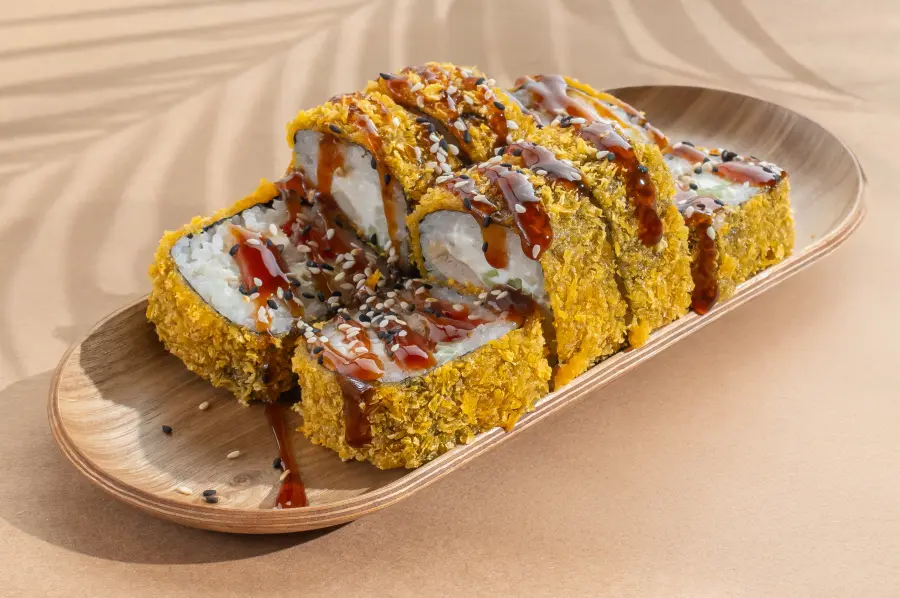 Ingredients: teriyaki chicken, cream cheese, cucumber, bell pepper, tempura flour, panko breadcrumbs, sesame.