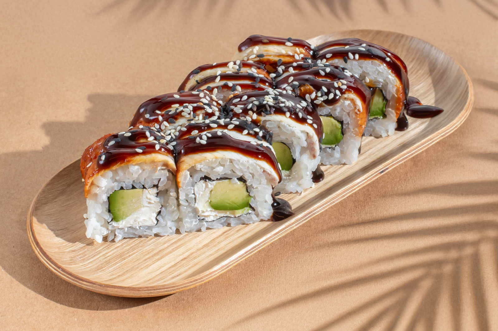 Ingredients: unagi, cream cheese, avocado, unagi sauce, sesame.
