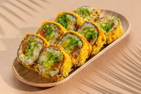 Айдахо Вес: 340 граммов. Состав: сурими, сливочный сыр, огурец, темпурная мука, сухари панко, спайси соус. С роллом идет комплект из соевого соуса, имбиря и васаби.Пищевая ценностьна 100 г 188ккал 5,9 гбелки 7,8 гжиры 23,5 гуглеводы на порцию 667ккал 21 гбелки 27,7 гжиры 83 гуглеводы на штуку 83ккал 2,6 гбелки 3,5 гжиры 10,4 гуглеводы Цена 990 RSD В корзину