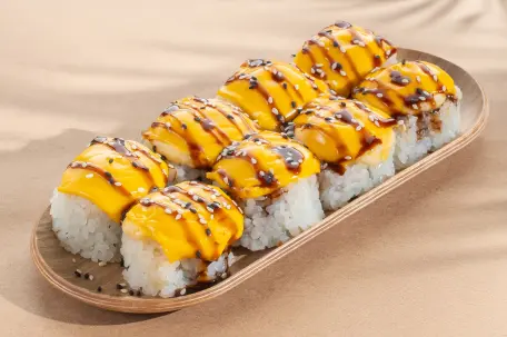 Furai Težina: 380 grama.Sastojci: gambori, surimi, čedar, krastavac, krem sir, majonez, sriracha, terijaki.Rolna dolazi sa besplatnom porcijom soja sosa, vasabija i đumbira. Nutritivna vrednostna 100 g 218kcal 10,5 gproteini 13 gmasti 14,6 gugl. hid. na porciju 828kcal 39,9 gproteini 49,4 gmasti 55,5 gugl. hid. na komad 92kcal 5 gproteini 6,2 gmasti 6,9 gugl. hid. Cena 1090 RSD Dodaj u korpu