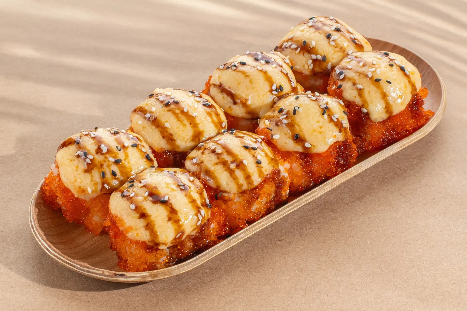 Sastojci: krem sir, losos, krastavac, edam, majonez, masago, tobiko, terijaki sos, susam.