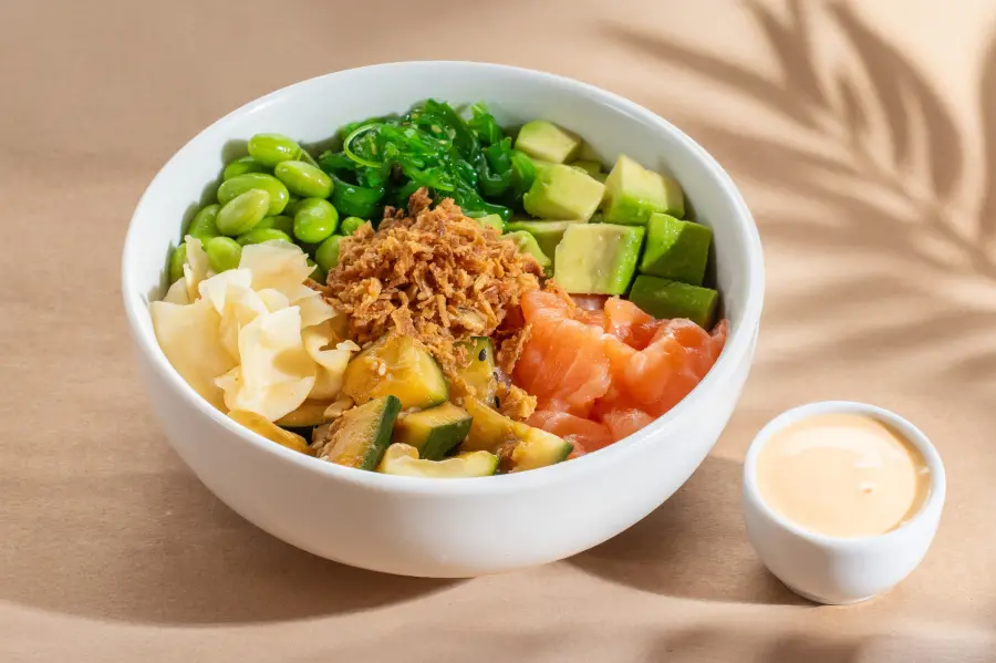 Sastojci: pirinač, losos, razbijeni krastavci, avokado, đumbir, edamame, goma wakame, prženi luk, spajsi ajoli sos.