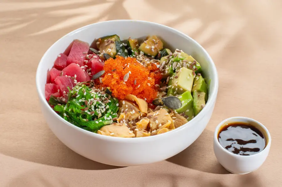 Sastojci: pirinač, tuna, razbijeni krastavci, avokado, kukuruz, tobiko, goma wakame, mix semenki, terijaki sos.