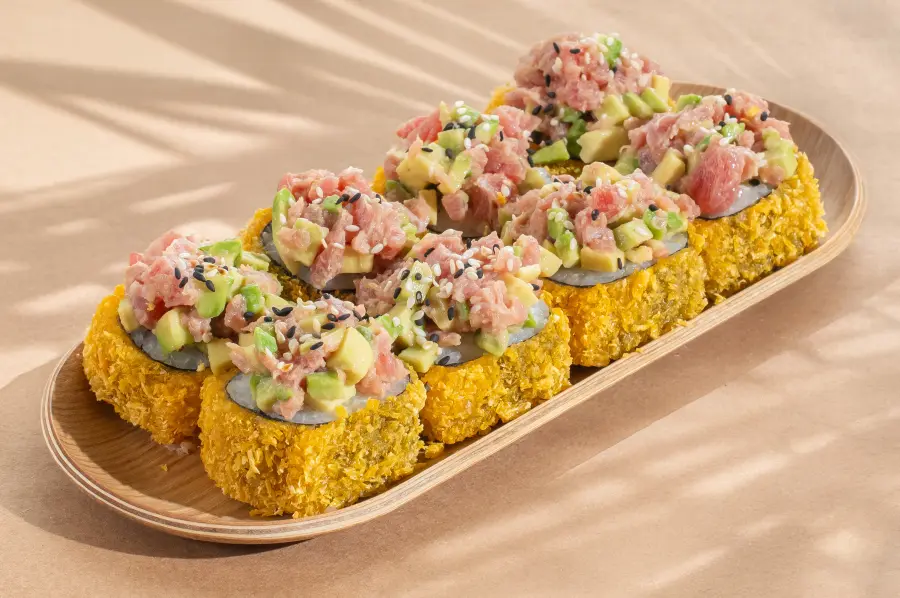 Sastojci: tuna, avokado, spajsi sos, krem sir, krastavac, tempura brašno, panko prezle.